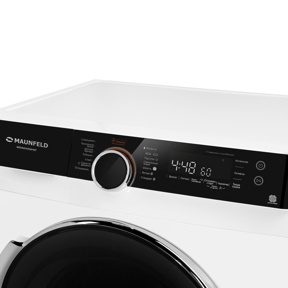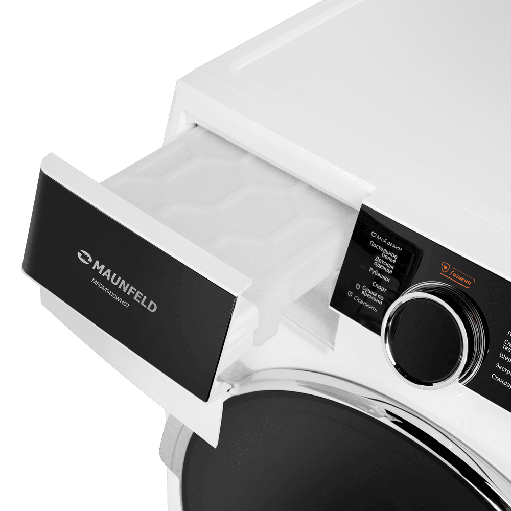 Сушильная машина с инвертором и тепловым насосом MAUNFELD MFDM1410WH07 создана для бережной и эффективной сушки большого объёма белья. Технология Heat Pump направляет тёплый сухой воздух в камеру, мягко удаляя влагу из тканей и возвращая его через испаритель без необходимости дополнительного вентиляционного канала. Съёмный резервуар для конденсата позволяет разместить технику там, где вам удобно, без привязки к стационарному сливу.