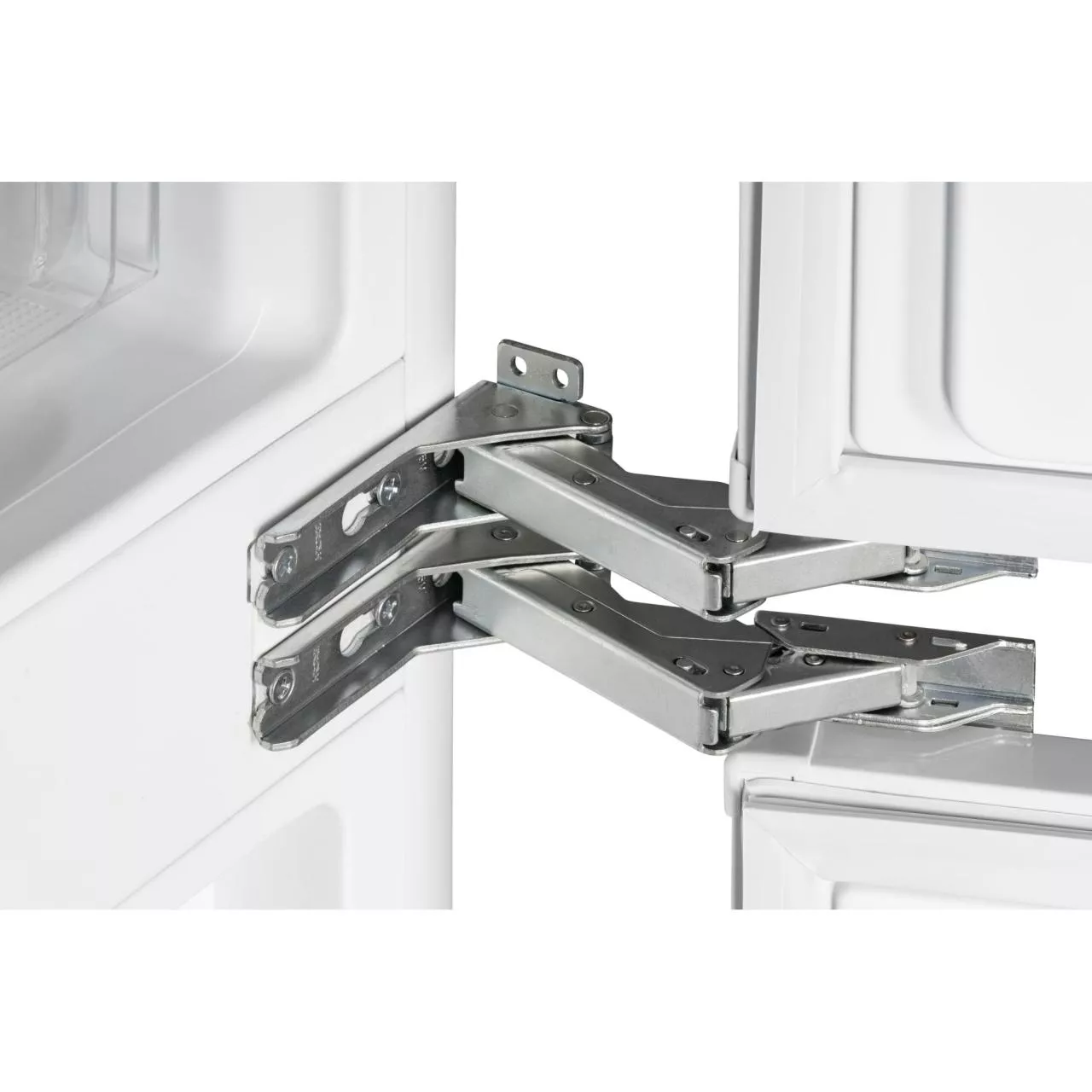 Холодильник имеет жесткую систему крепления фасадов. При таком монтаже фасады не связаны с корпусом шкафа и не предполагают наличие дополнительных петель. Конструкция не ограничена углом открывания и не имеет зазоров, в которых может скапливаться пыль и грязь.
